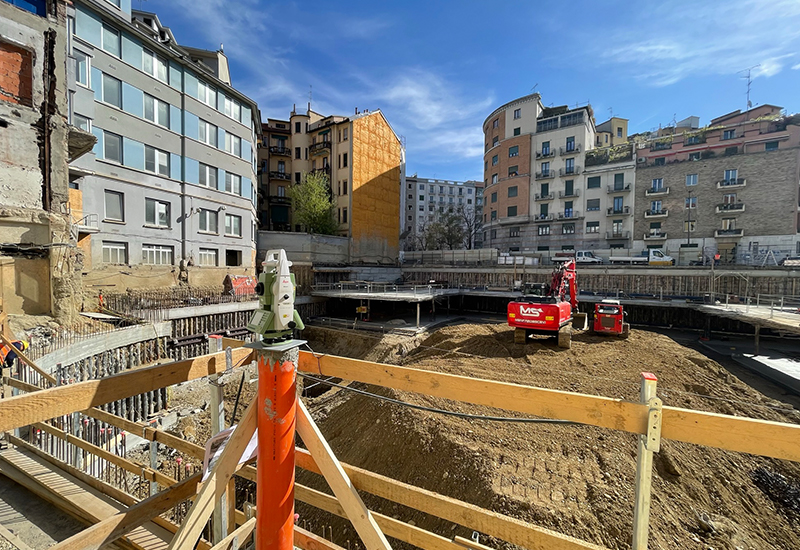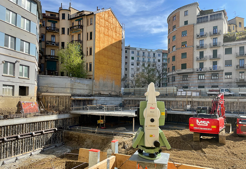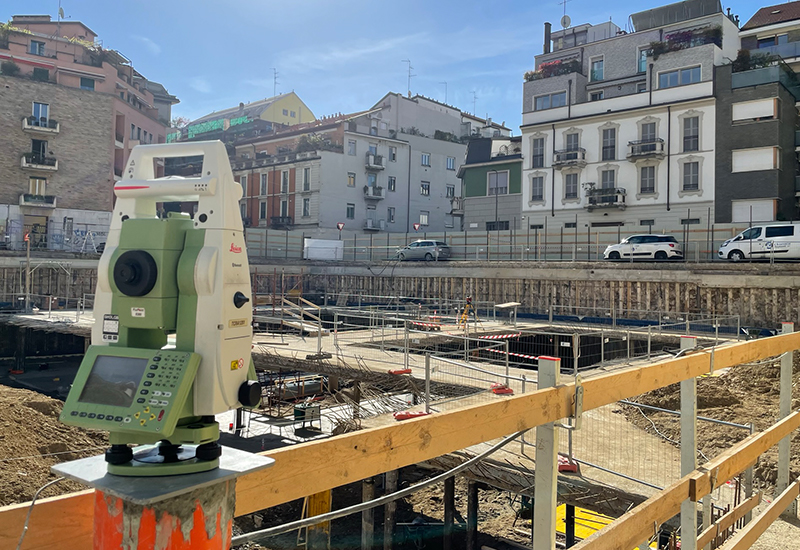Monitoraggio edifici limitrofi ad area di cantiere e trave di coronamento, Rilievo eseguito con Stazione Totale robotizzata Leica TCRA 1201, proecisione 1″ angolare, e miniprismi.